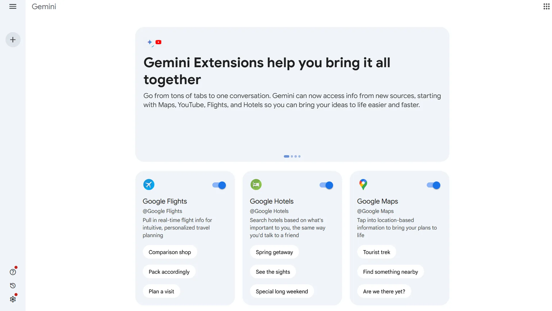 The goal of Gemini's extensions is to make using the platform easier and more efficient. This makes them comparable to Chrome and other web browser extensions. Sixteen first-party services, including Google Flights, Hotels, Maps, Workspace, YouTube, and YouTube Music, are already connected through extensions offered by Gemini. Gemini can now obtain real-time personal data and incorporate it into user requests thanks to these integrations. This could be determining the distance between a store and your friend's house or obtaining information from Google Flights about an impending vacation.